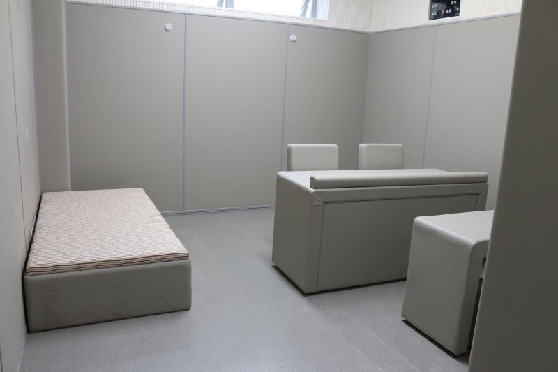 留置室內(nèi)部還有專用的獨(dú)立衛(wèi)生間,內(nèi)部墻面也是設(shè)置安裝的留置室軟包,然后室內(nèi)衛(wèi)浴采用的是專用硅膠防撞洗手臺(tái)、硅膠防撞馬桶。其材質(zhì)全部都是防火阻燃材料,內(nèi)含暗藏式水箱,暗藏式水龍頭等等,是衛(wèi)生間內(nèi)部防撞系統(tǒng)建設(shè)的一大組成,實(shí)現(xiàn)完整的留置室室內(nèi)安全軟包防撞系統(tǒng)。