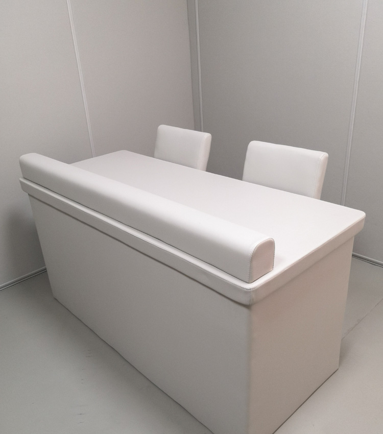 一般標(biāo)準(zhǔn)功能齊全的談話室,在配備上應(yīng)該具備盥洗室、留宿設(shè)備、訊問空間,可以完成被留置人的訊問、過夜、衛(wèi)生解決需求。一般來說談話室面積不低于30平米、但是和監(jiān)察委在各自職能上有所區(qū)分,所以在內(nèi)部設(shè)施的配備上有所不同。出于對被留置人員的安全保護(hù),在安全配套上、留置場所軟包和談話室墻面軟包必須要按照各地紀(jì)檢委阻燃軟包的相關(guān)要求對談話室阻燃軟包進(jìn)行相關(guān)的嚴(yán)格測試,阻燃等級必須達(dá)到b1級防火等級,軟包材料內(nèi)甲醛和苯的釋放標(biāo)準(zhǔn)必須達(dá)到室內(nèi)環(huán)境排放標(biāo)準(zhǔn),否則超標(biāo)的有害物質(zhì)味道大,對人體造成不可逆的危害損傷。需要對談話室墻面軟包材料進(jìn)行檢測。