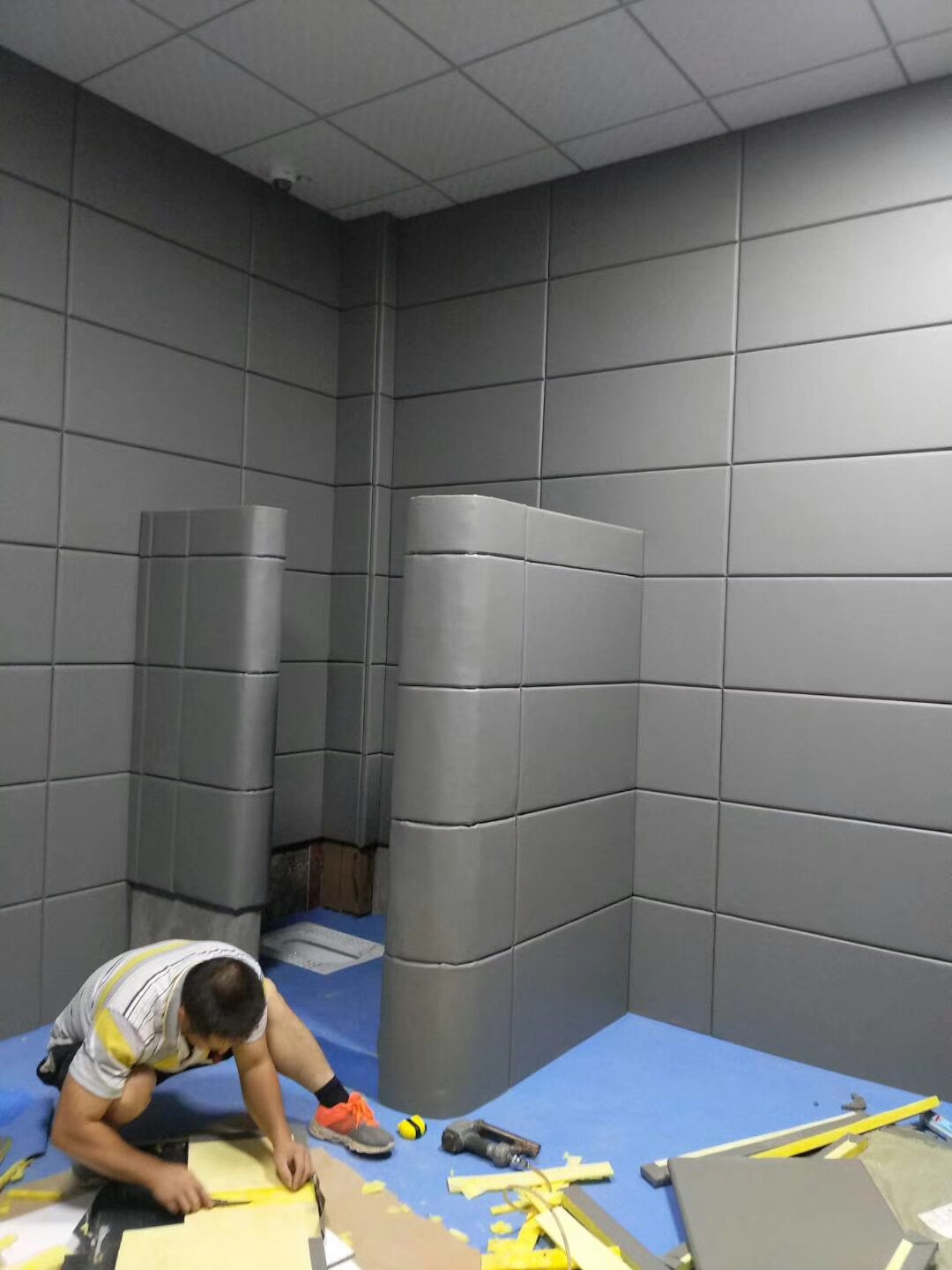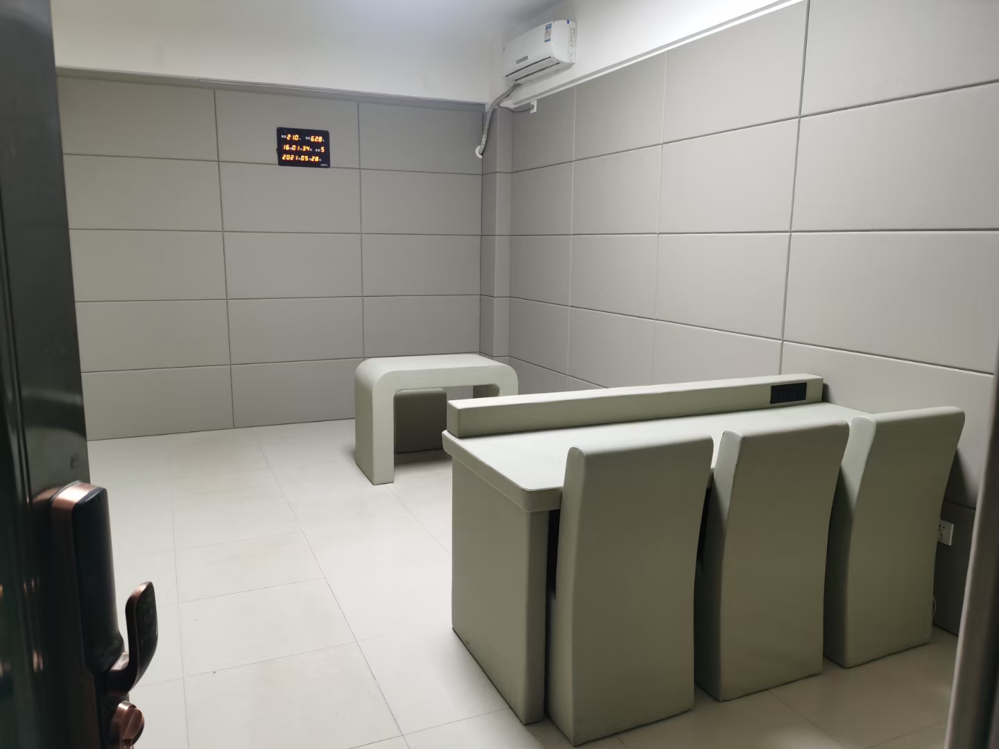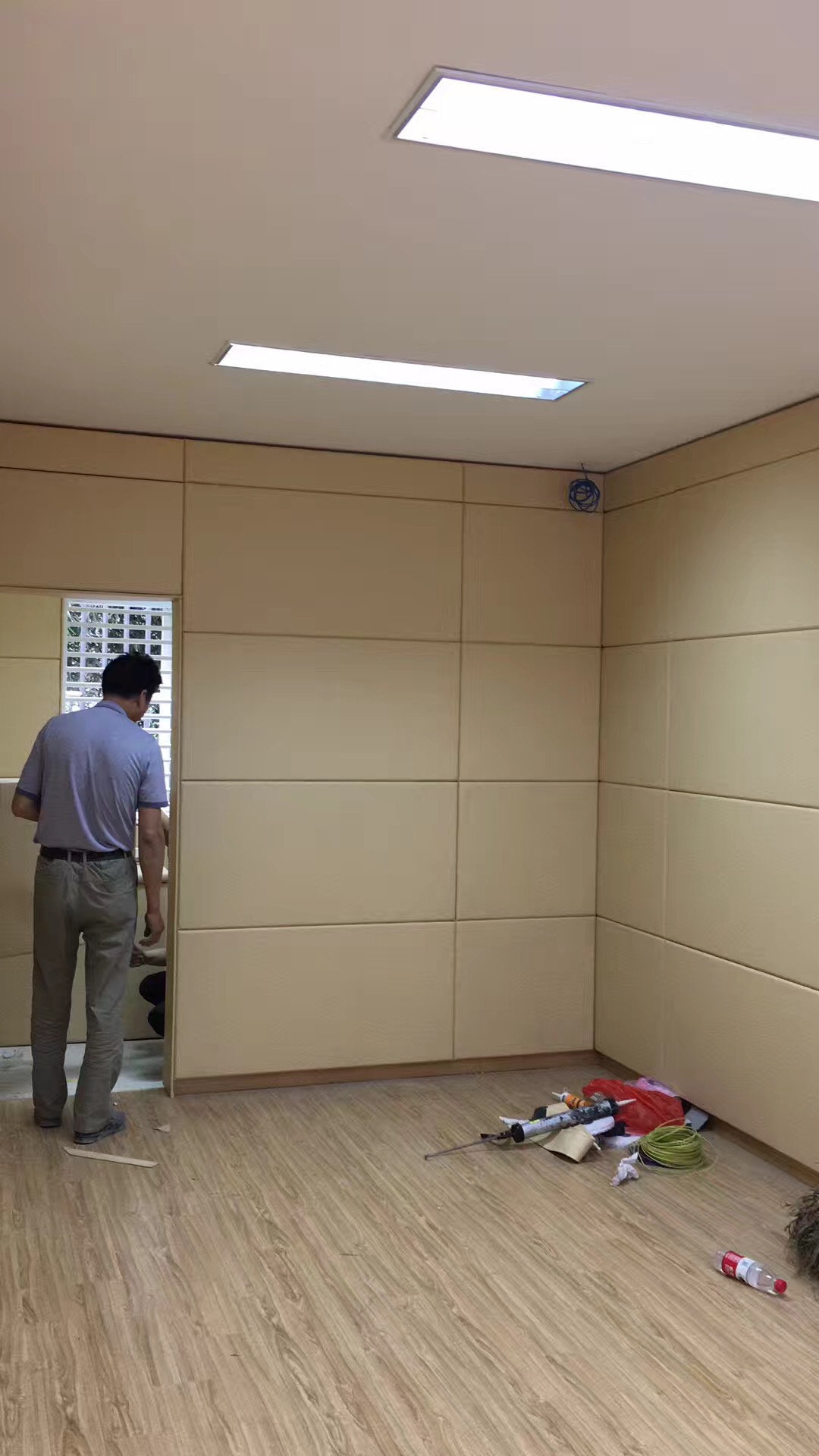 3.施工后,查看軟包墻板邊緣是否有縫隙,如縫隙較大可補膠處理,留置室四周陰陽角施工在軟包背面基材開直角槽,小木條加F30射釘固定墻板,待拆下無脫落現象即可用硅膠中線條封邊。