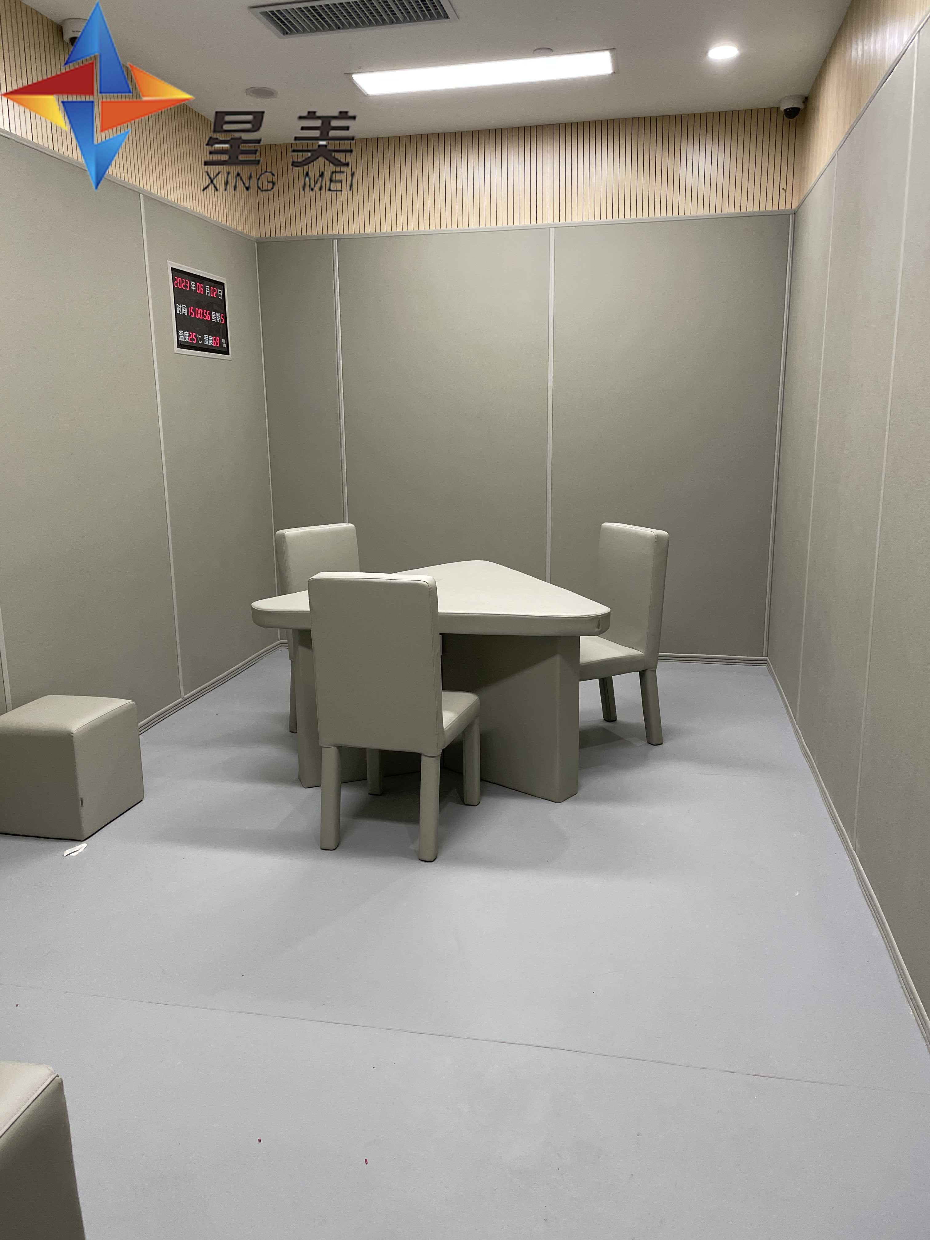 傳統的墻面防撞材料,經常會顧此失彼,所以有不少的短板。要么是防撞性能低,要么是防撞不防火有消防隱患,要么是只能防撞部分地方,不能全面防撞。以前傳統的海綿軟包和玻璃纖維棉軟包材料已經不能滿足現代紀委審訊室的裝修標準了,紀委審訊室是個特殊的場所,涉及的都是一些特殊人員,所以對審訊室裝修要求使用高標準材料,星美聲學新型紀委審訊室墻面軟包剛好符合這一特性。