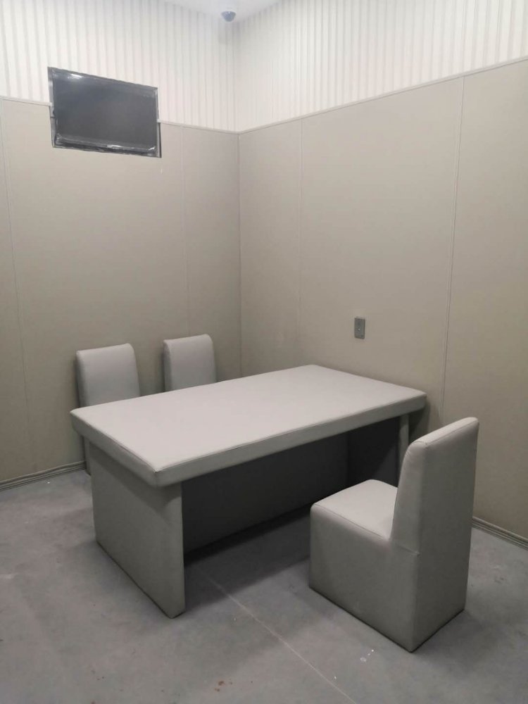 目前,紀委審訊室墻面裝修有了新要求,為進一步防止被談話人的人身安全,尤其是防止頭撞墻的事情發生,室內墻面應用厚度大于20mm阻燃防撞軟體材料進行覆蓋,不允許意外事件發生。
